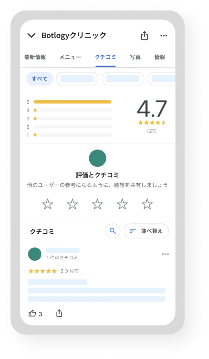 弊社が開発した満足度調査アンケートを患者さまに回答していただくことにより、良いアンケート内容をGoogleの口コミに掲載することができます。